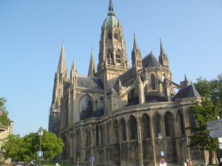 | 宿泊地・バイユーへ着いたのは夕方だが、日が長いので観光には充分。世界遺産になっている長さ70mの刺繍タペストリーを見に。光に当って色褪せるのを防ぐため、暗〜い室内に展示されている布を、オーディオガイドを手にゆっくり見て廻る。11世紀にイングランドに侵入し、一時は支配したノルマンディ公国の王ウィリアムには大義があったと主張する内容が、丁寧に刺繍されていて眼を見張る。 町は往時ノルマンディ公国の首都だった、小さいけれどとても雰囲気のある古都で、大聖堂も立派。大聖堂の前には古代の遺跡もある。 |