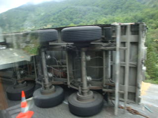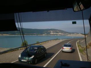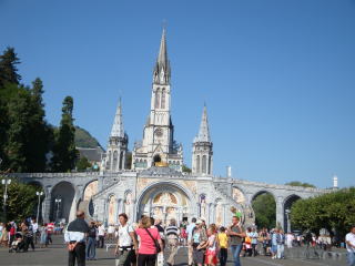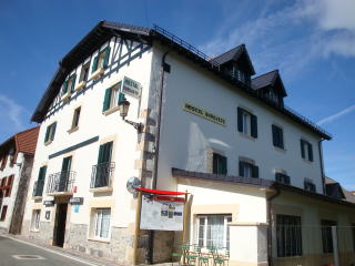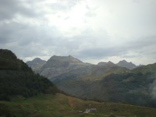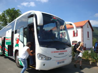 パンプローナから次の目的地、フランスのサン・ジャン・ピエ・ド・ポーまで、バスも電車もありません。バスで仏西国境のロンセスバイエスまで行って、そこからタクシー・・・、それは冒険でした。 何しろロンセスバイエスには教会と数軒の家しか無いとネットに書いてあったので、日本から電話してタクシーを確保しようと思ったのですが、失敗。 バスの終点ロンセスバイエスに行ってみたら、その日に限って冷たい雨の日。観光をしている人なんて見当たらず、周りの建物も何が何だか判らず、訊けるような相手も見当たらず。 観光は明日にしようという事で、誘われた乗り合いタクシーで、サン・ジャン・ピエ・ド・ポーまで行ってしまいました。 乗り合わせたのは全員巡礼さんだったみたい。リュックの上に私達の固いスーツケースが載って、ご機嫌斜めでした。 |
