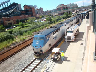 ![]() デンバー駅で給油。左はロッキーズの球場 |