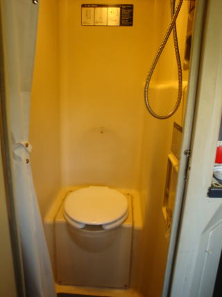 シャワー兼用のトイレ。シャワーを使うと室内全部がびしょぬれになってしまうので、使うには、かなり抵抗あり。 |