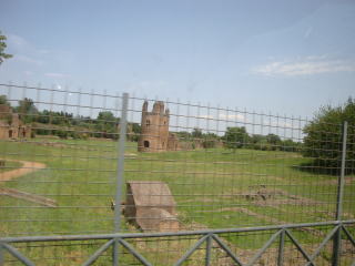アッピア街道を巡るアルケオバスはコースも短くなって期待はずれ。本数も少なくなっており、一時間毎出発とされているが出発時のルーズなやり方を見ると、次のバスが何時来るかアテに出来ず、バス停には日陰も人家も殆ど無いので、暑い中バスを降りて観光するのは躊躇われた。下りて観光している外国人はかなりいた。沢山のローマ遺跡があって、もう少し涼しい時期ならば楽しめたかも。でもバスが来なかったら歩くしかない、ローマ時代そのままに。バスから見た沿道の遺跡群。