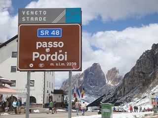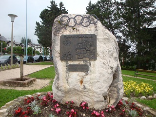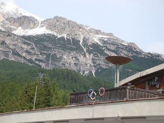 地上に降りると再び暖かい。コルチナダンペッツォのオリンピック記念碑。周りにはスポーツ施設が。 近くのホテルの看板に昔の旅の様子が。
