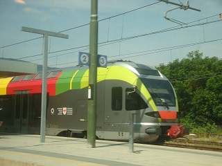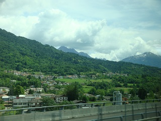可愛い色の電車、さすがイタリア、でも駅のプレートはドイツ語が先、同じ場所が全く違う名前の不思議。沿線は巨大な山々が続く。