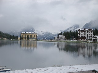 トレチーメへ行く予定の日、アララ、お天気が・・・。この先は通行止めとのことで哀れなミズリーナ湖のほとりで諦めきれずしばし散策。でもトレチーメへ行く手段も無く、GIVE UP。
