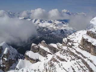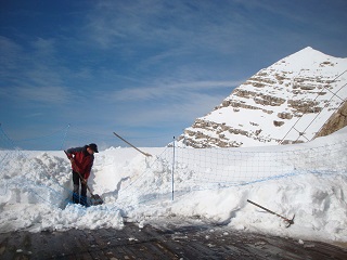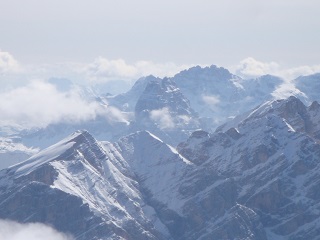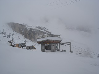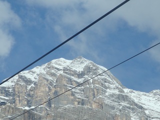 ベネチア行きの日。バスの時間までまたケーブルカーで山を見に。昨日より高いTOFANAへ。凄い雪でケーブルカー駅にはつらら、雪かきも。下界は絶好のハイキング日和。