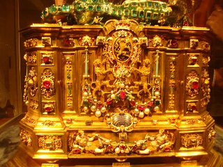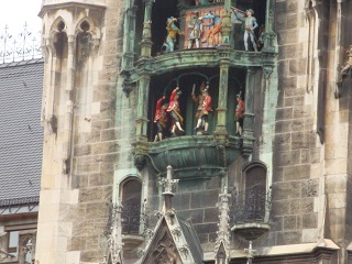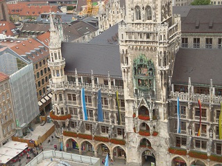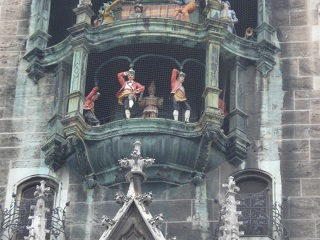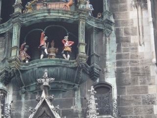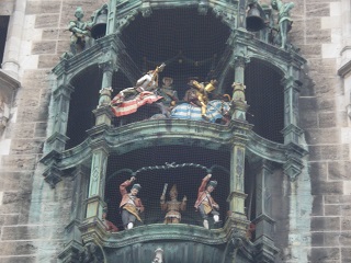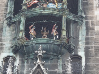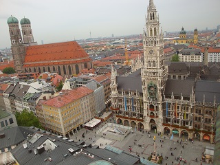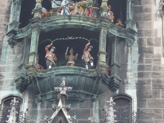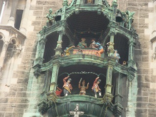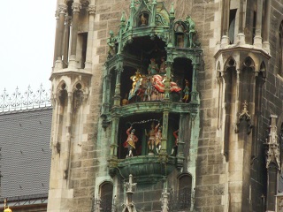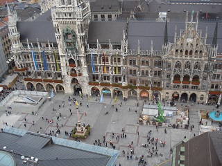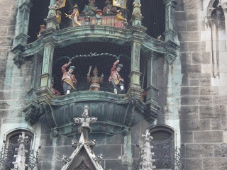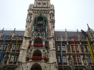 続いて古色蒼然たるミュンヘン新市庁舎。お化け屋敷のような外見。ドイツ最大の仕掛け時計には大勢の群衆が見入る。斜め向かいのペーター教会の上にあがると仕掛け時計の人形が至近で見える。
