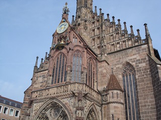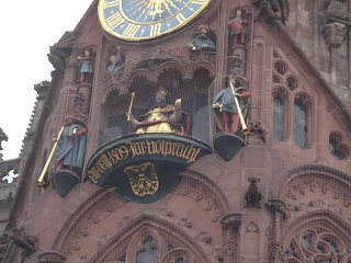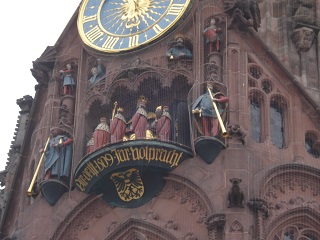 フラウエン教会:クリスマスマーケットで有名な中央広場に立つ面白い形の教会。カール大帝と7人の選帝侯の仕掛け時計が12:00に動く