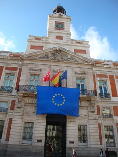SOLに。駅名まで命名権は問題だ・・・。広場のそばには「熊とやまももの像」があるが、ちょっと分かりにくい。 マドリードはスペイン全土の中心として意図して作られた首都だが、プエルタ・デル・ソル広場には地理上の中心地ゼロ地点もある。 ゼロ地点の正面には市庁舎。大晦日に市庁舎の時計台の鐘に合せて葡萄を食べると幸運になると言われている。 |
