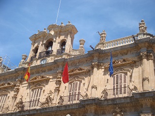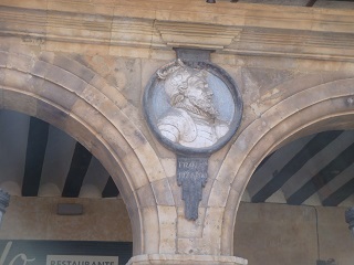 マヨール広場:市庁舎前の広場。建物の壁にはスペインの歴史上の人物のレリーフが飾られている