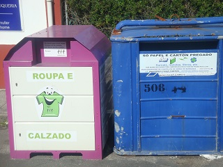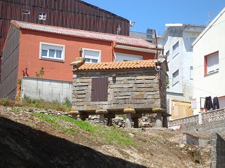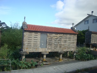 イベリア半島の北西部はケルト・ イベリアと呼ばれる文化圏で二種 の特徴のある住民集落で知られ ている。そのひとつである紀元前 9−4世紀に由来する長方形の家 屋は、日干し煉瓦の壁、板を骨組 みとした萱葺きの片流れ屋根が 特徴で、穀物庫として使われ、 オレオと呼ばれ先史時代の農耕 革命のシンボルとされている。 フィニステールへ行く途中にはた くさん見られる。 →対照的な21世紀の分別ごみ箱 |