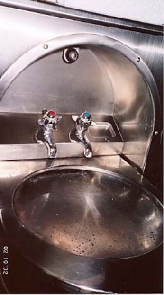・乗るとまず、食事の時間を訊きに来る。 ・・食堂車は全員が二回に分けて入るスペースになっているので、前・後どちらにするかを決める。 ・・乗車後すぐに食事になるような気がするが、「前」の方が時間的に余裕があると感じた。前・後は色分けした食券のようなもので区別するが、見せることは無かった。 ・次に、車掌は室内の説明をする。 ・・私たちはツインの一等車。室内に付いているトイレ・シャワーの使い方。洗面台もトイレも壁面に収納されていて、使用時に出す。 |