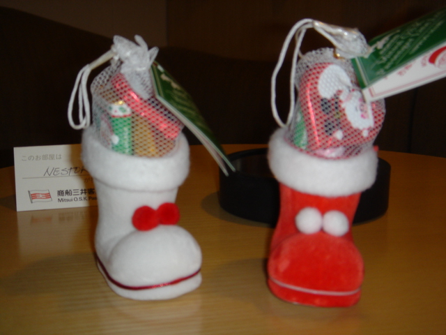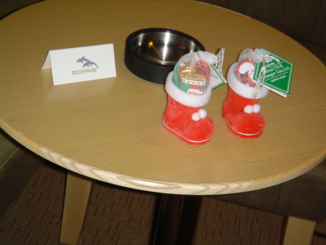 さて見学が終わって自室に戻ると、テーブルの上には可愛いサンタのお菓子。クリスマスですね〜。